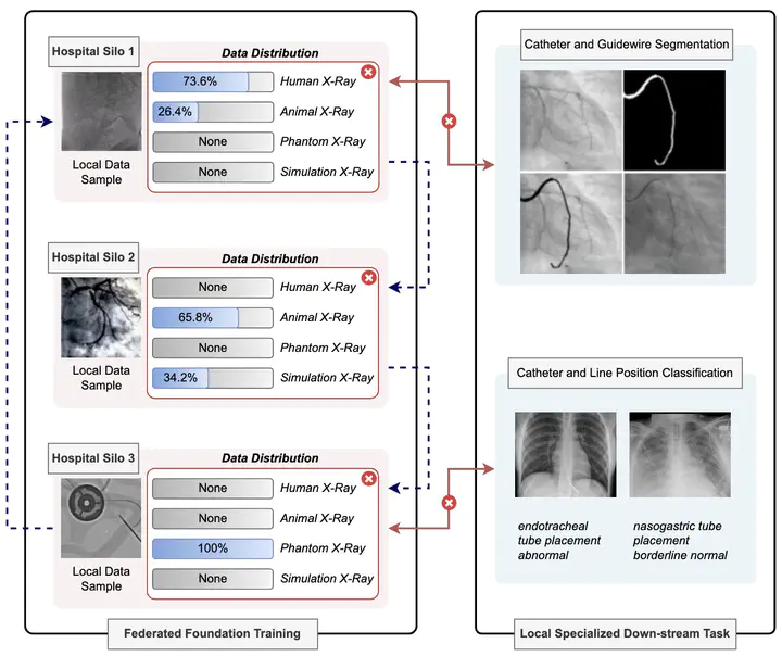 Unseen data issue visualization. Red lines with crosses indicate insufficient data for training. Blue dotted lines between data silos indicate transferable weights.In endovascular surgery, the precise identification of catheters and guidewires in X-ray images is essential for reducing intervention risks. However, accurately segmenting catheter and guidewire structures is challenging due to the limited availability of labeled data. Foundation models offer a promising solution by enabling the collection of similardomain data to train models whose weights can be fine-tuned for downstream tasks. Nonetheless, large-scale data collection for training is constrained by the necessity of maintaining patient privacy. This paper proposes a new method to train a foundation model in a decentralized federated learning setting for endovascular intervention. To ensure the feasibility of the training, we tackle the unseen data issue using differentiable Earth Mover’s Distance within a knowledge distillation framework. Once trained, our foundation model’s weights provide valuable initialization for downstream tasks, thereby enhancing task-specific performance. Intensive experiments show that our approach achieves new state-of-the-art results, contributing to advancements in endovascular intervention and robotic-assisted endovascular surgery, while addressing the critical issue of data sharing in the medical domain.