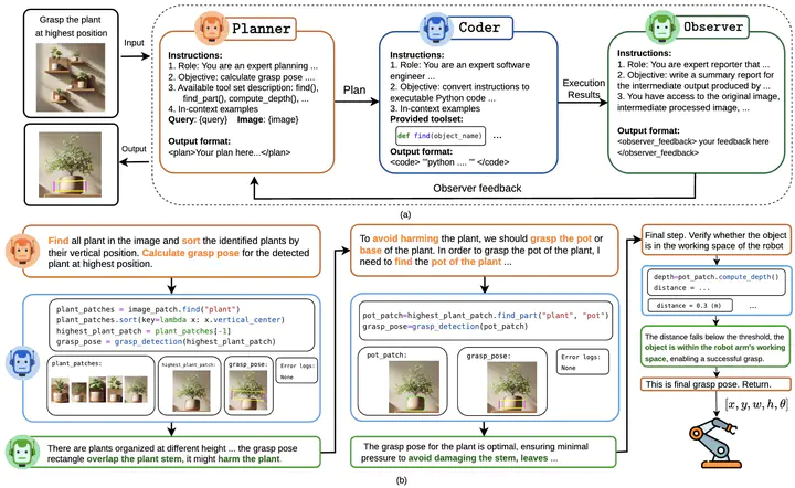(a) An overview of our GraspMAS framework, a multi-agent system for zero-shot language-driven grasp detection. GraspMAS consists of three agents: Planner (orange box) – controls the reasoning flow; Coder (blue box) – executes instructions using the provided toolset; and Observer (green box) – evaluates results and provides feedback to the Planner; (b) A successful example demonstrating how our framework enables reasoning grasp detection by leveraging multi-agents knowledge and commonsense understanding.Language-driven grasp detection has the potential to revolutionize human-robot interaction by allowing robots to understand and execute grasping tasks based on natural language commands. However, existing approaches face two key challenges. First, they often struggle to interpret complex text instructions or operate ineffectively in densely cluttered environments. Second, most methods require a training or fine-tuning step to adapt to new domains, limiting their generation in real-world applications. In this paper, we introduce GraspMAS, a new multi-agent system framework for language-driven grasp detection. GraspMAS is designed to reason through ambiguities and improve decision-making in real-world scenarios. Our framework consists of three specialized agents- Planner, responsible for strategizing complex queries; Coder, which generates and executes source code; and Observer, which evaluates the outcomes and provides feedback. Intensive experiments on two large-scale datasets demonstrate that our GraspMAS significantly outperforms existing baselines. Additionally, robot experiments conducted in both simulation and real-world settings further validate the effectiveness of our approach. Our project page is available at https://zquang2202.github.io/GraspMAS.