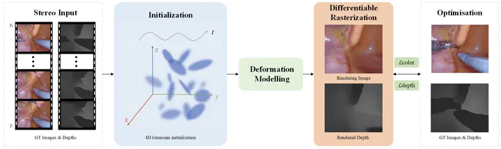Overall of the proposed framework. Starting from an image and depth sequence, we associate 3D points between frames to initialise the Gaussian point cloud. Then, given a specific time t, the attributes of the Gaussians are modified by the deformation model and rendered as a 2D image and depth map. Finally, colour and depth loss are employed to refine results.Accurate 3D reconstruction of dynamic surgical scenes from endoscopic video is essential for robotic-assisted surgery. While recent 3D Gaussian Splatting methods have shown promise in achieving high-quality reconstructions with fast rendering speeds, their use of inverse depth loss functions compresses depth variations. This can lead to a loss of fine geometric details, limiting their ability to capture precise 3D geometry and effectiveness in intraoperative application. To address these challenges, we present SurgicalGS, a dynamic 3D Gaussian Splatting framework specifically designed for surgical scene reconstruction with improved geometric accuracy. Our approach first initialises a Gaussian point cloud using depth priors, employing binary motion masks to identify pixels with significant depth variations and fusing point clouds from depth maps across frames for initialisation. We use the Flexible Deformation Model to represent dynamic scene and introduce a normalised depth regularisation loss along with an unsupervised depth smoothness constraint to ensure more accurate geometric reconstruction. Extensive experiments on two real surgical datasets demonstrate that SurgicalGS achieves stateof-the-art reconstruction quality, especially in terms of accurate geometry, advancing the usability of 3D Gaussian Splatting in robotic-assisted surgery.